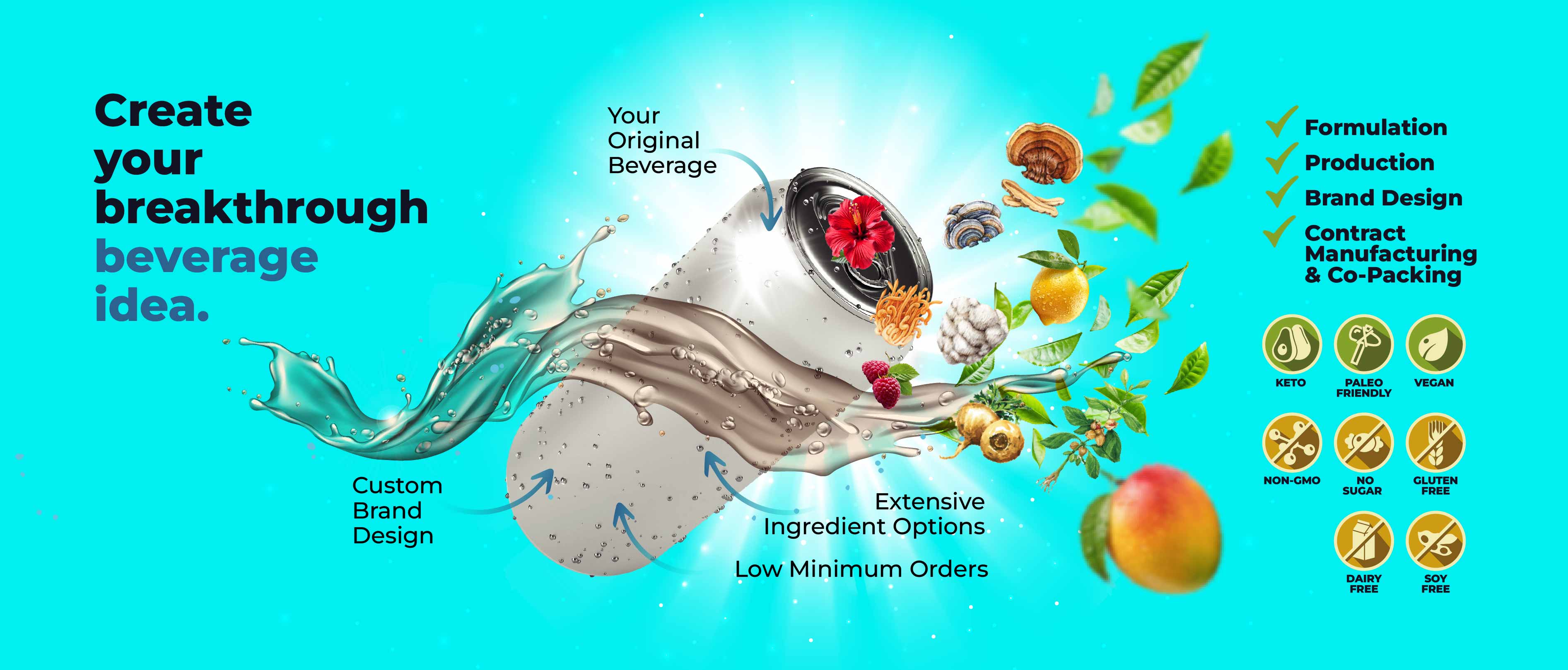 Elevate Your Beverage Brand-Without the Overhead A trusted partner in private-label manufacturing, handling every step (Formulation, co-packing, sustainable packaging) so you can focus on building your brand.